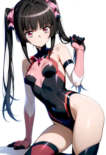 black hair,hime cut,blunt bangs,pink eyes,twintails,small breasts