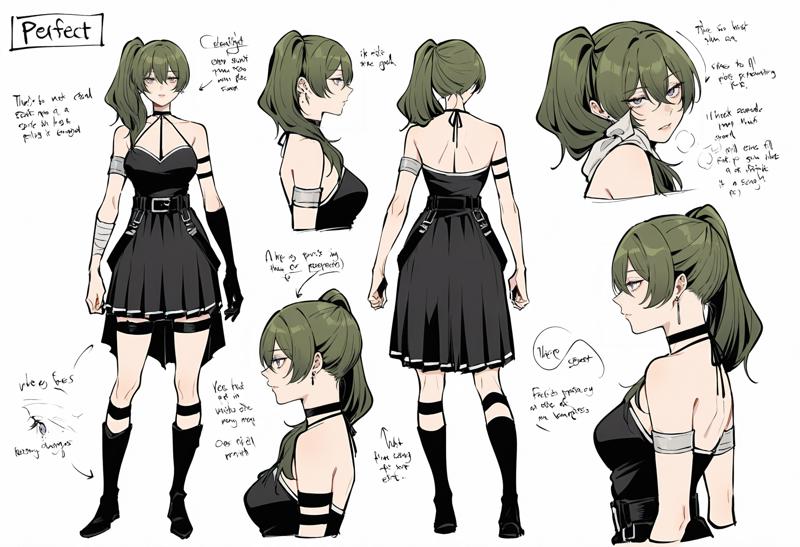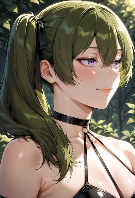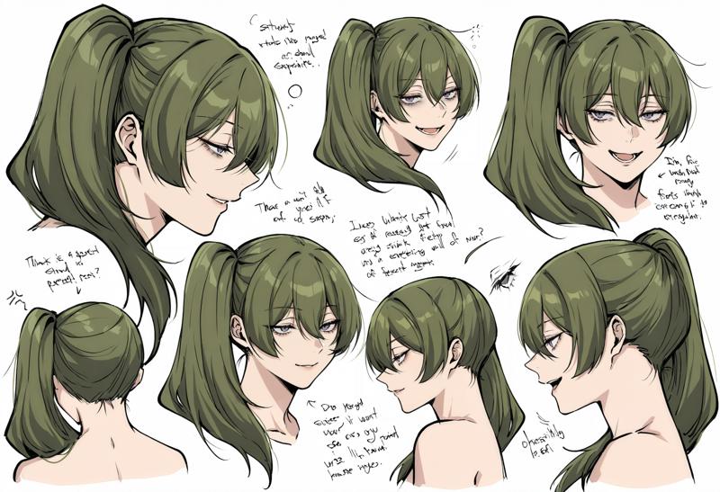 1girl,grey eyes,purple eyes,green hair,long hair,hair between eyes,ponytail,side ponytail,bangs