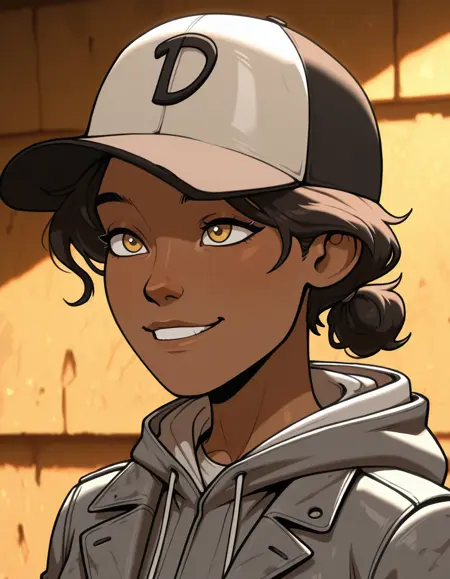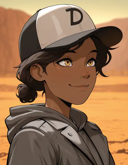 -ponpuclementine,1girl, hat,dark skin,brown eyes,yellow eyes,solo,brown hair,black hair, dark-skinned female,grey jacket,hood down,pants,