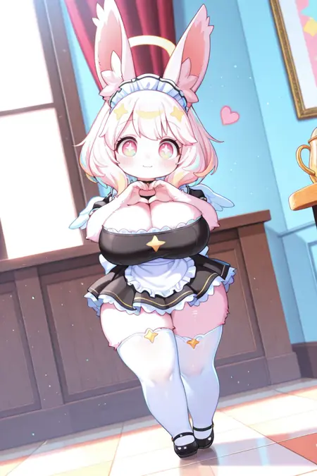 solara, furry, furry female, shortstack, multicolored eyes, white hair, halo, angel wings, star-shaped pupils, symbol-shaped pupils, huge breasts,