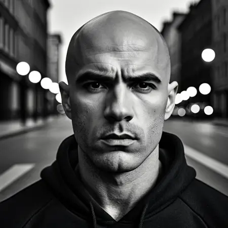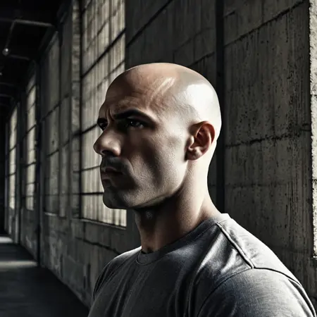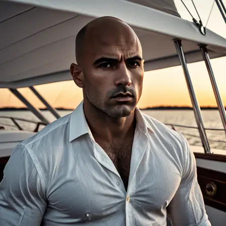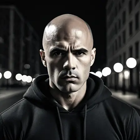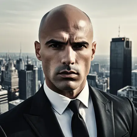 - 完璧な外見:禿げ、濃いひげ、頬の傷、鋭い暗い目
