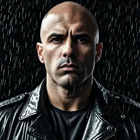 - シグネチャーなルック:ブラックレザージャケット、シネマティックなリムライティング、純黒の背景
