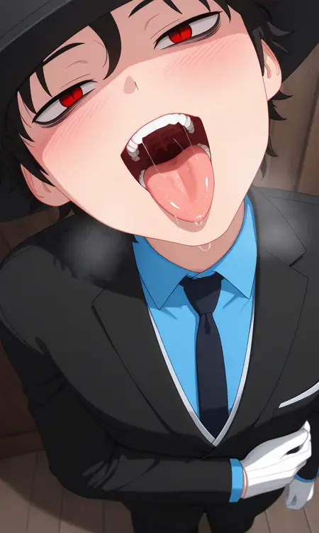 Cloches: black suit,blue shirt,black hat,black pants,white gloves,neck tie,