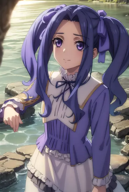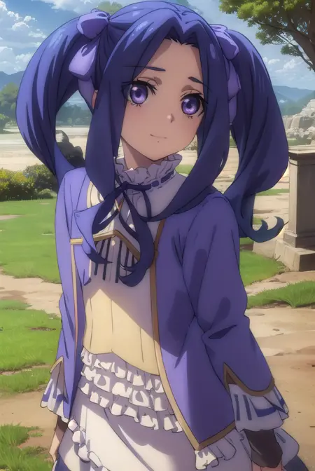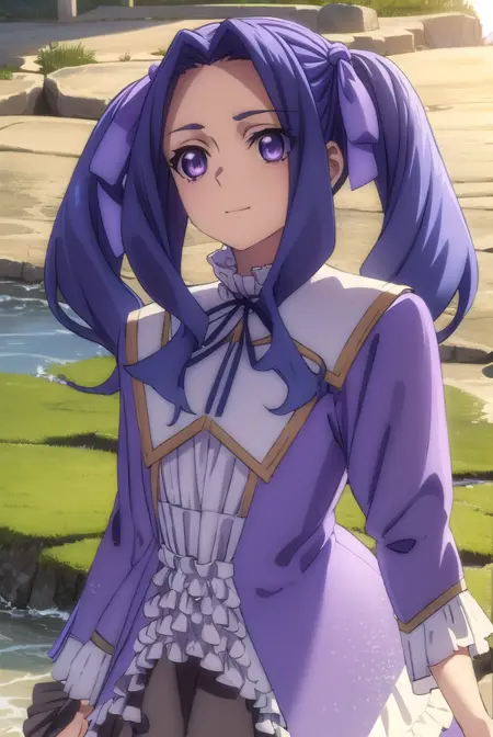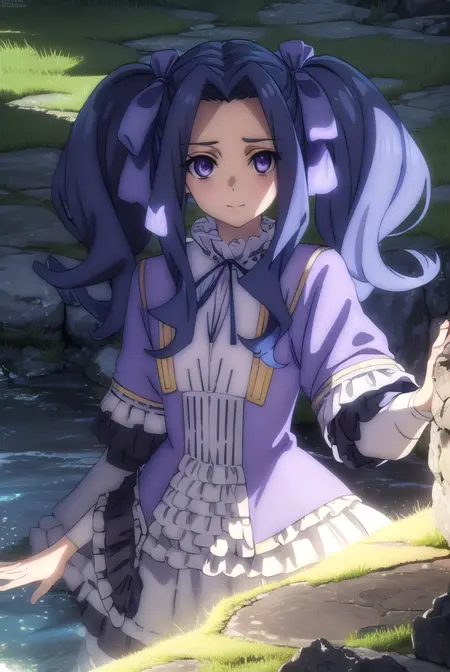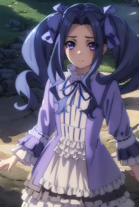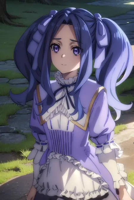 melty q melromarc, 긴 머리, 리본, 더블 테일, 파란 머리, (보라색 눈:1.1), 머리 리본, 보라색 리본, (중간 갈라진 앞머리:1.5),