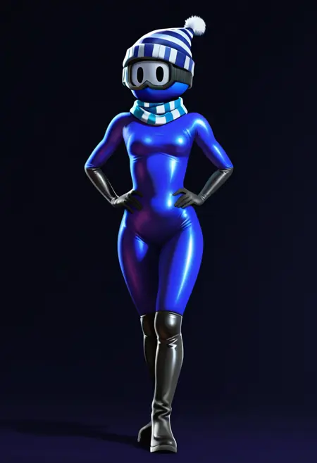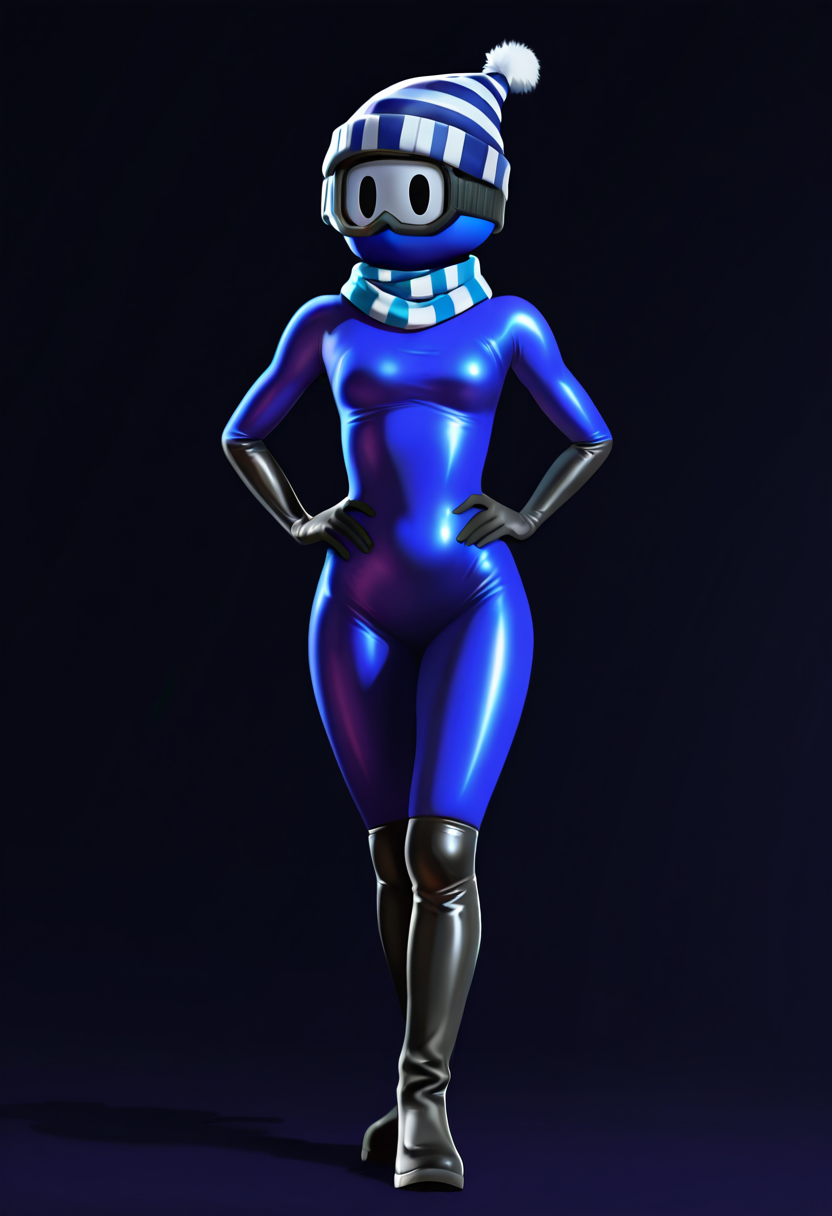 winteroutfit, black ski goggles, black eyes, black elbow gloves, black long boots, indigo suit, blue and white striped scarf, blue and white striped hat with a pompom