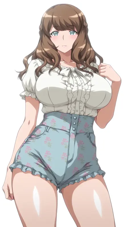 anime coloring, masterpiece, best quality, amazing quality, 4y4m1, 1girl, long hair, brown hair, frenche braid, aqua eyes, large breasts, shirt, frilled shirt, white shirt, short sleeves, high-waist shorts, blue shorts, floral print, solo, pose, standing, looking at viewer, from front, ((((white background, simple background))))