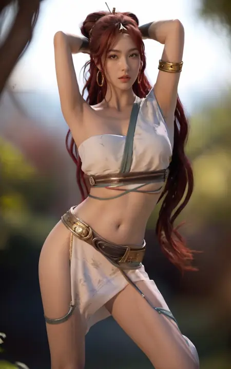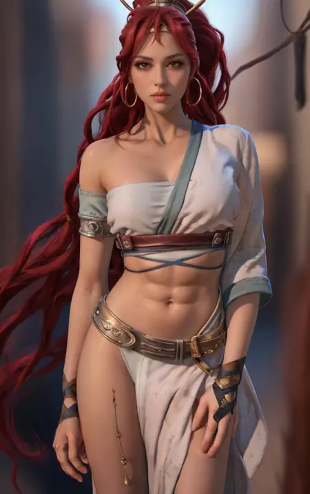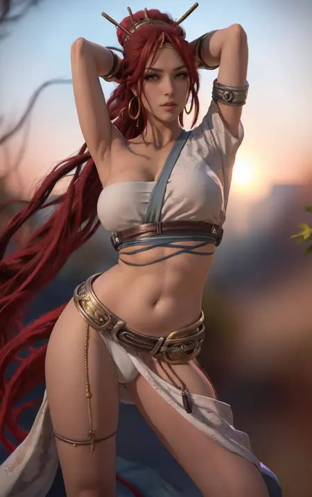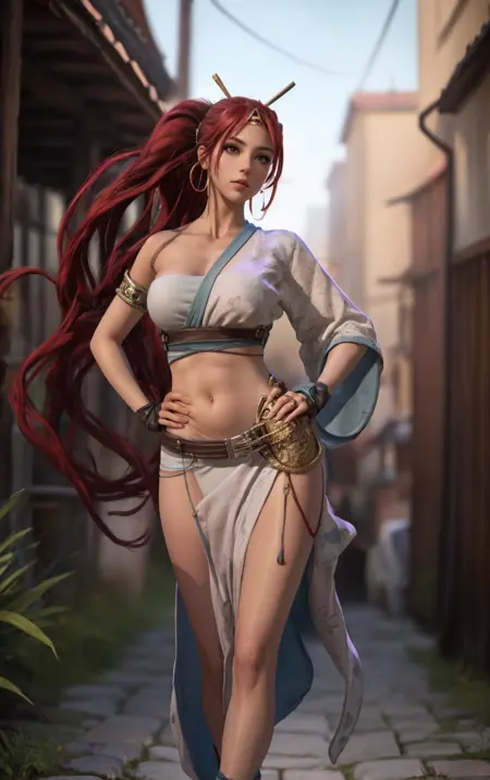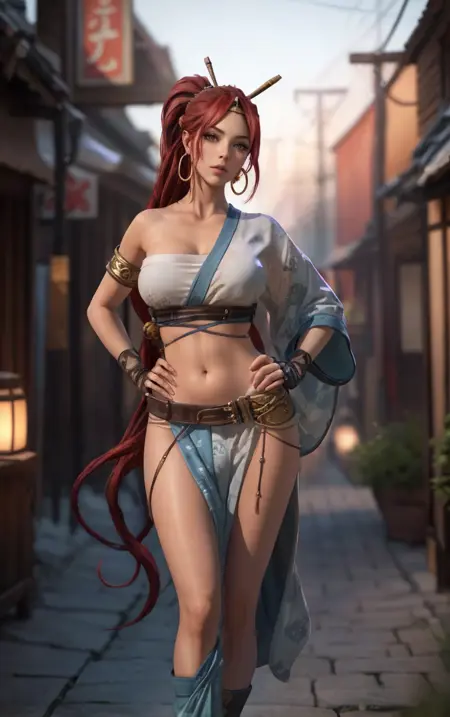 - 1girl, red hair, absurdly long hair, long hair, navel, midriff, very long hair, ponytail, breasts, large breasts, lips, brown eyes, hoop earrings, toned, narrow waist, hair_stick,