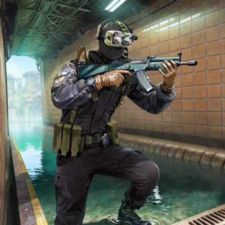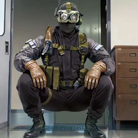 追加ワード:茶色の手袋、黒い靴、黒いズボン、タクティカル服、時計、黒いジャケット、ベルト、マスク、ゴーグル、ヘッドセット