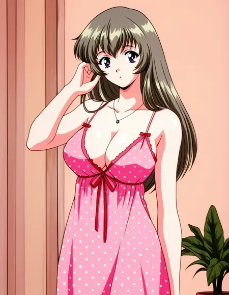 mai_yuukasc,long_hair,grey_hair,blue_eyes,large_breasts,polka_dot_dress,pink_dress,sandals