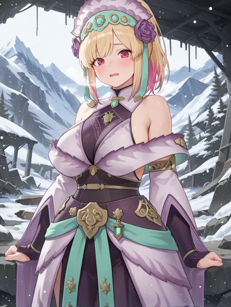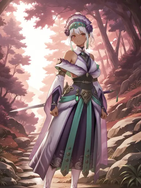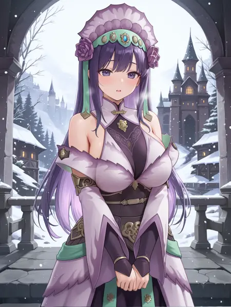 标签(服装1):Hirabami盔甲、紫色玫瑰头饰、紫色连衣裙、紫色分体袖子、黑色腰带、紫色膝靴
