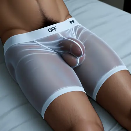 covered_penis, covered_testicles, bulge, pubic_hair_peek, fine_fabric_emphasis, realistic, photorealistic,