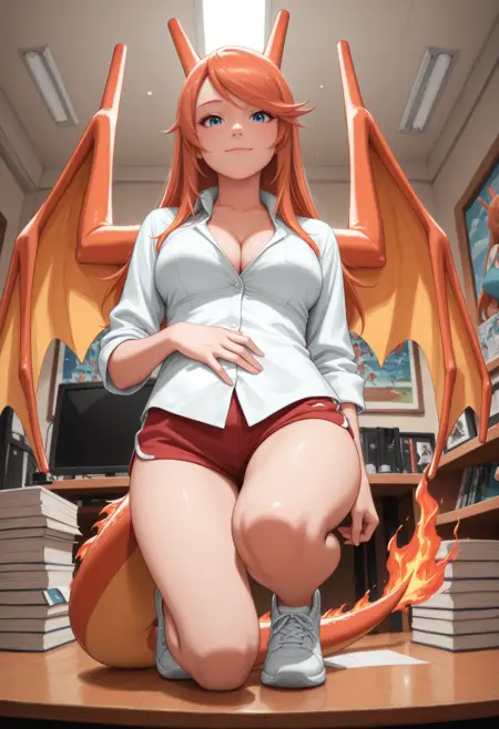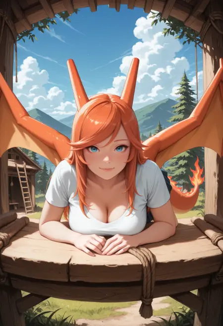 (Positive Prompts) lynchar, personification, monster girl, dragon girl, dragon wings, dragon tail, horns, orange hair, blue eyes, long hair, swept bangs, large breasts,