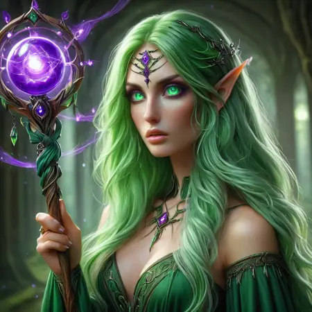"A towering forest ent stands majestically in the heart of an ancient, magical forest, surrounded by towering trees and glowing flora. Its massive, bark-covered form is entwined with moss, vines, and blooming flowers, radiating the essence of nature. In one gnarled hand, it holds a colossal staff made of living wood, crowned with a vibrant green orb that pulses with life energy. The orb’s glow illuminates the forest floor, causing roots and plants to grow and twist in response. Tiny woodland creatures gather around, drawn to its aura of harmony and power. The ent’s glowing, emerald-green eyes peer with wisdom and resolve, as leaves rustle gently in the air around it. Shafts of sunlight filter through the canopy above, casting dappled light on the mystical scene, where nature’s magic is at its strongest. orb staff"