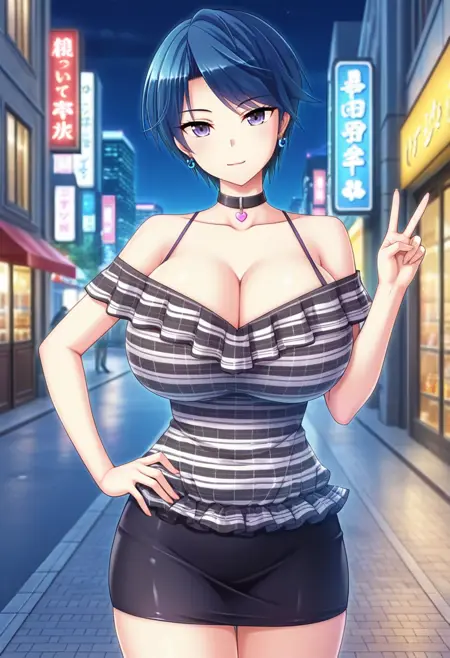 3 心形项圈,胸罩肩带,露肩衬衫,胸部显露,条纹衬衫,无袖,黑色迷你裙,铅笔裙
