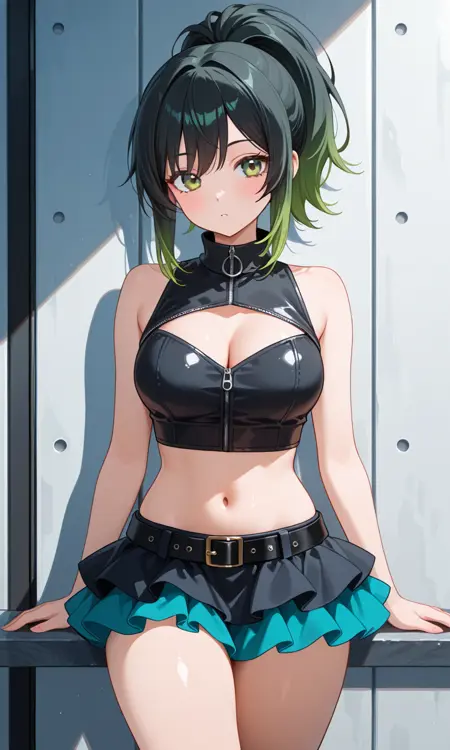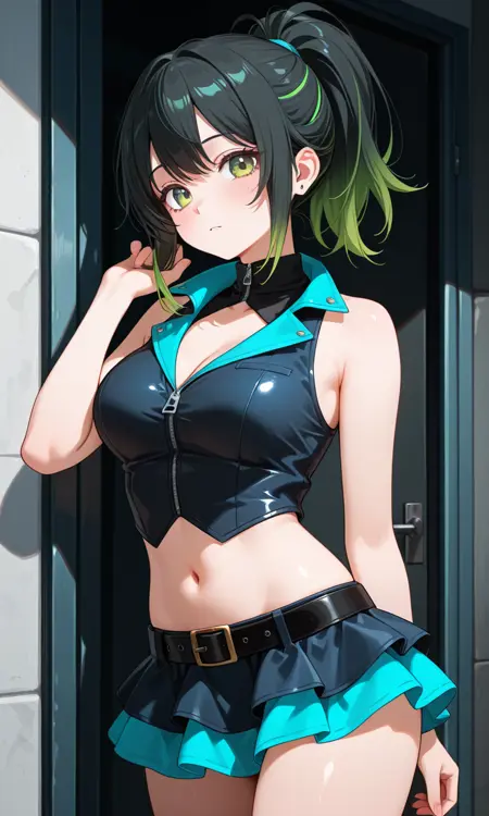 유키 미야자와(Falling Stars), 긴 머리, 검은 머리, 녹색 머리, 다색 머리, 그라데이션 머리, 포니테일, 중간 길이 포니테일, 이톤 헤어, 중간 크기 가슴, 허벅지, 조끼는 높은 칼라와 깊은 V넥을 갖추고 있으며, 벨트, 검은 벨트, 검정과 파란 조끼, 소매 없는 조끼, 미니 치마, 레이어드 치마, 파란 미니 치마, 검은 미니 치마, 어깨 노출 디자인, 버클, 지퍼, 복부 노출