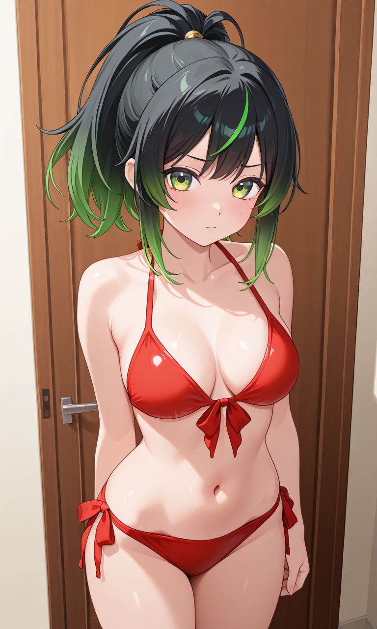 유키 미야자와(Falling Stars), 긴 머리, 검은 머리, 녹색 머리, 다색 머리, 그라데이션 머리, 포니테일, 중간 길이 포니테일, 이톤 헤어, 중간 크기 가슴, 허벅지, 사이드 타이 비키니 하의, 비키니, 빨간 비키니, 프런트 타이 상의