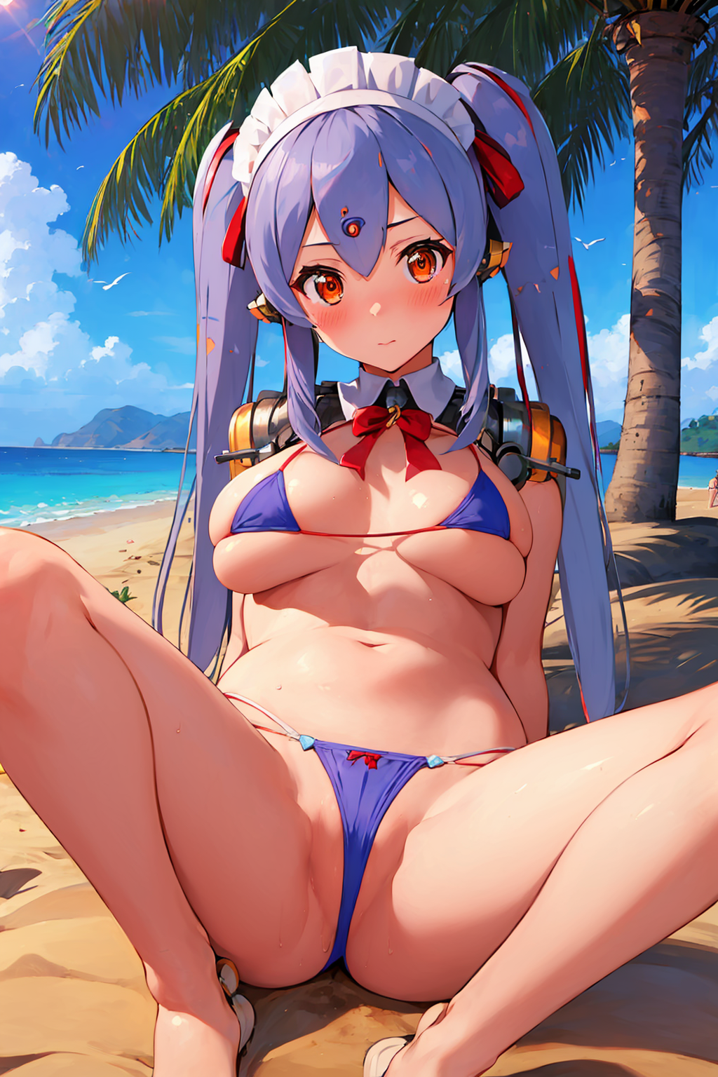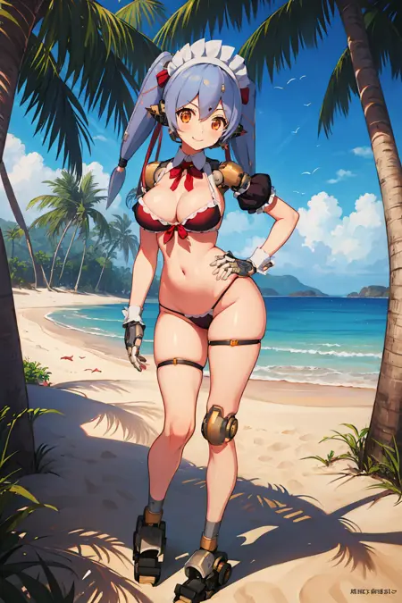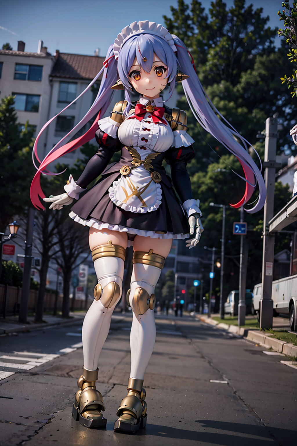 hanajkmaid,1girl,机器人关节,机器人,机器人尖耳,蓝色高双马尾,长发,紫色头发,蓝色头发,白色女仆头饰,红色长发丝带,橙色眼睛,游戏3D风格||红色领结,大胸部,长朱丽叶袖,白色女仆围裙黑色短裙,白色镶金边大腿袜,橙色吊袜带,