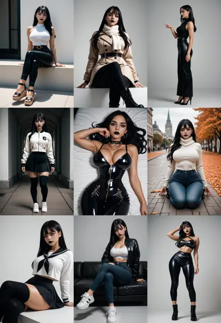 {__basemodel/full__} : provides a full description of a woman: look, outfit, camera and pose + background