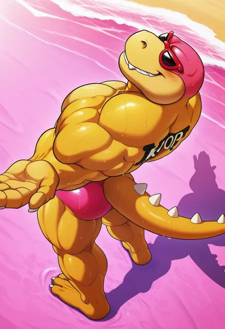 강화 프롬프트: "풍리 남성, 비늘 피부, 가시 꼬리, 노란 꼬리, 숨겨진 눈"