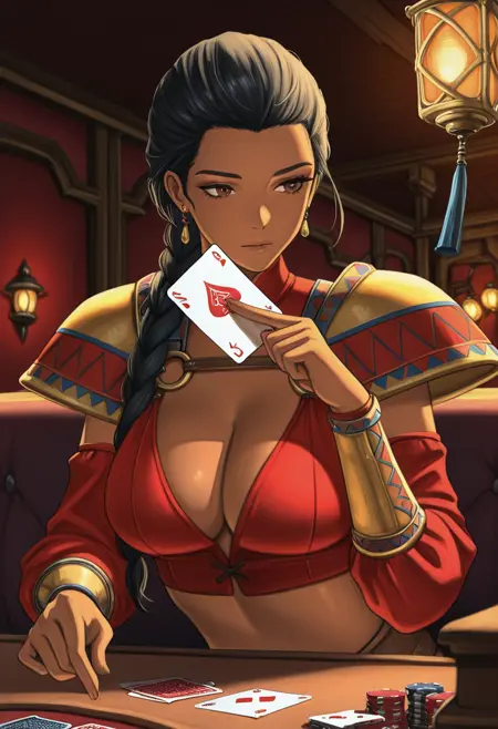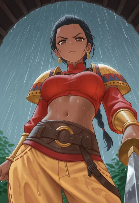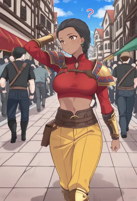 shirt, red shirt, shoulder armor, breasts, bracer, white pants, midriff, navel, belt, knee armor, boots,