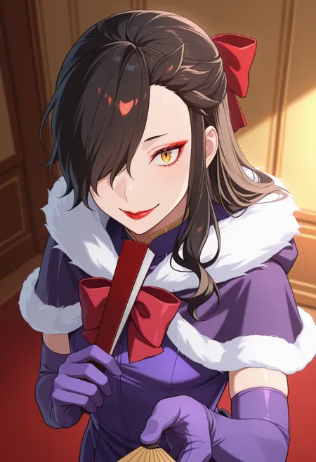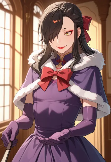 紫色手套, 肘部手套, 红色蝴蝶结, 扇子, 紫色连衣裙, 毛皮镶边, 小斗篷