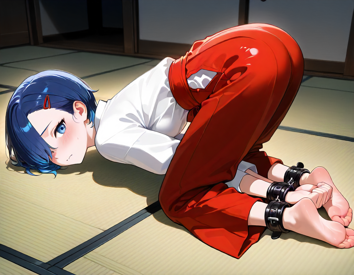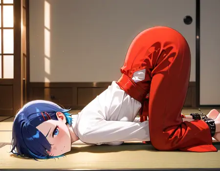 トリガーワードは「floor_stock」、推奨プロンプトは「top-down bottom-up,bound ankles,bound wrists,leather cuffs,wrists bound to ankles,」あたりになります。「on floor」「bed」「mattress」はお好みで。