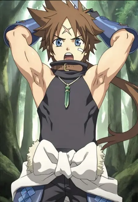 | トレーニングワード | Alba, brown hair, ponytail, forehead scar, blue eyes, cheek band aid, black sleeveless turtleneck shirt, brown neck belt, necklace, blue vambraces with black straps, black gloves, white jacket tied around hips, black shorts, blue thigh armor, blue armor bootsコピーしました! |