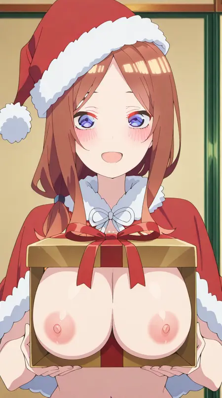 lora:breasts-in-a-box-illustriousxl-lora-nochekaiser:1, breasts in a box, solo, looking at viewer, blush, smile, open mouth, hat, holding, navel, nipples, upper body, fur trim, capelet, box, christmas, gift, santa hat, santa costume, gift box, fur-trimmed capelet, holding, holding box,