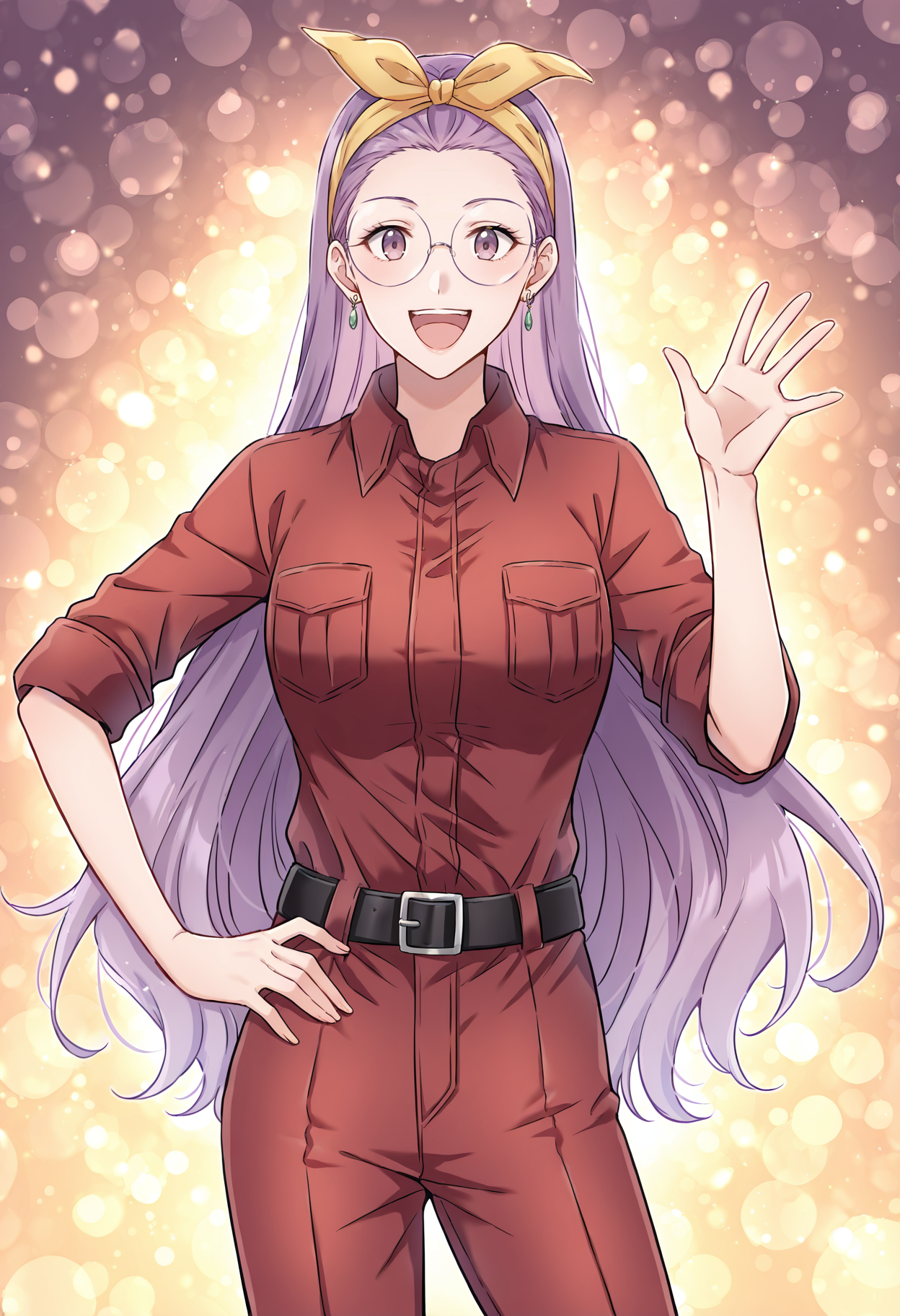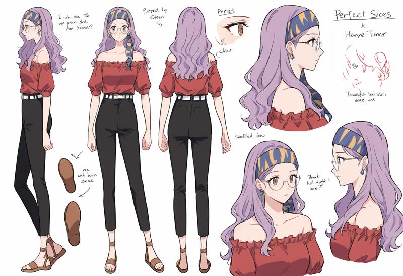 샌들, 귀걸이, 보석, 셔츠, 바지, 벨트, 어깨 노출 셔츠, 검은 바지, 어깨 노출, 어깨 드러냄, 빨간 셔츠, 짧은 소매, 헤드밴드, 흰 벨트, 머리끈, 갈색 신발, 퍼플 소매