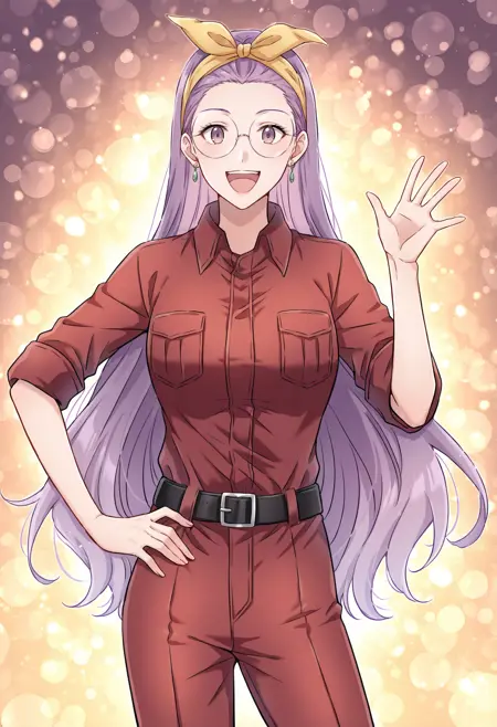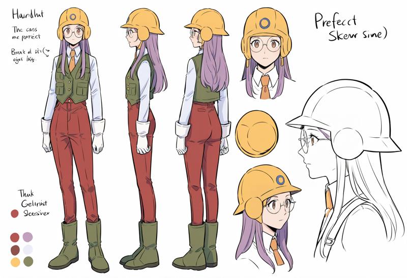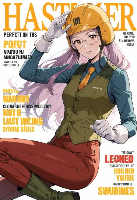 원형 안경, 헬멧, 안전모, 장갑, 녹색 신발, 부츠, 빨간 바지, 바지, 흰 장갑, 셔츠, 조끼, 긴 소매, 넥타이, 단추, 터틀넥, 노란색 머리 장식, 칼라 셔츠