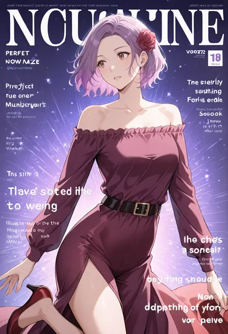 드레스, 벨트, 빨간 신발, 빨간 드레스, 긴 소매, 보라색 드레스, 신발, 어깨 노출 드레스, 어깨 노출, 어깨 드러냄, 하이힐, 보라색 신발