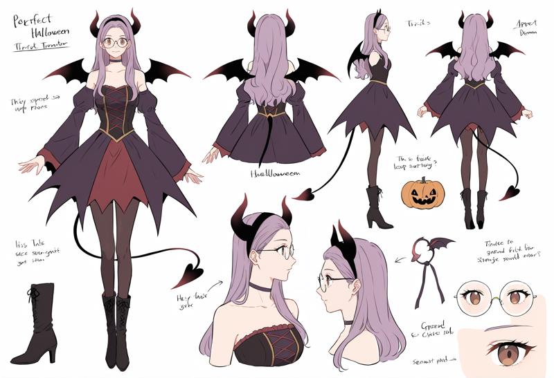 뿔, 악마 뿔, 날개, 칼라, 꼬리, 분리된 소매, 팬티스타킹, 박쥐 날개, 하이힐, 부츠, 드레스, 가짜 뿔, 헤드밴드, 할로윈 의상, 악마 꼬리, 치마, 악마 날개, 넓은 소매