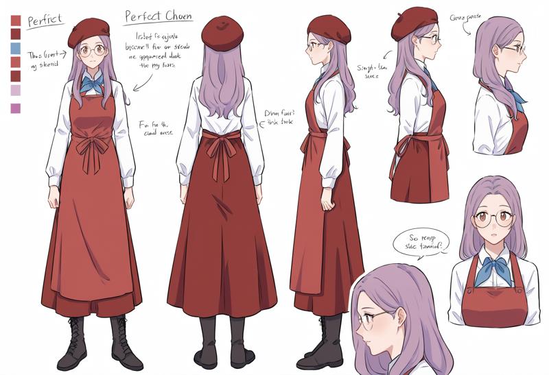 트윈테일, 앞머리, 모자, 치마, 빨간 머리 장식, 검은 신발, 긴 소매, 베레모, 빨간 치마, 셔츠, 앞치마, 흰 셔츠, 부츠, 신발, 바지, 긴 치마, 빨간 앞치마, 넥커치프