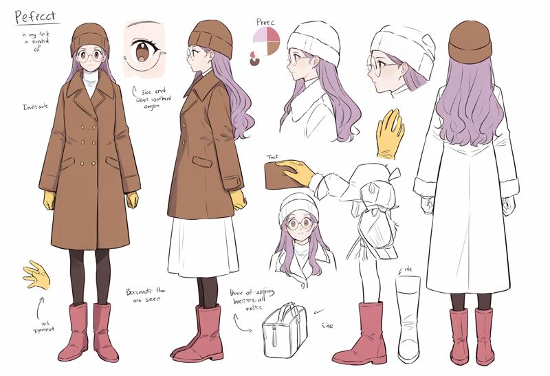 장갑, 원형 안경, 부츠, 코트, 모자, 노란 장갑, 팬티스타킹, 긴 소매, 갈색 머리 장식, 치마, 분홍 신발, 털 장식, 단추, 터틀넥, 빨간 신발, 겨울 옷, 재킷