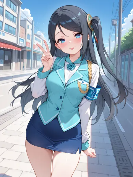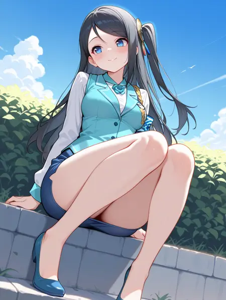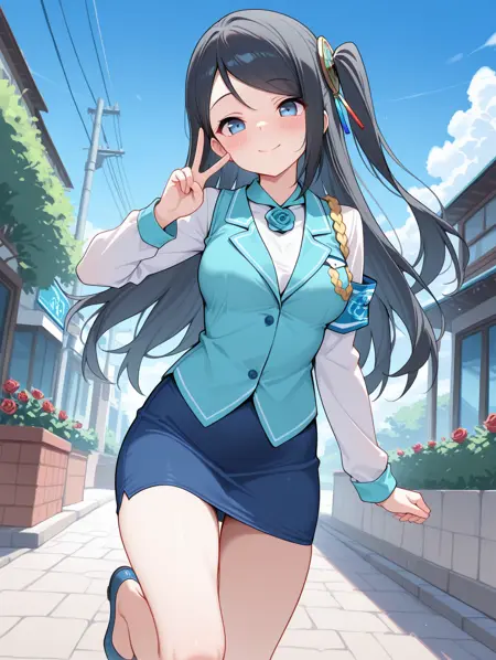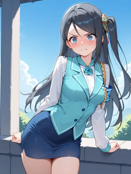 1girl, solo, long hair, blush, blue eyes, skirt, shirt, black hair, hair ornament, long sleeves, white shirt, frills, rose, blue rose, shoes, collared shirt, miniskirt, vest, blue skirt, one side up, armband, pencil skirt, blue footwear, blue vest