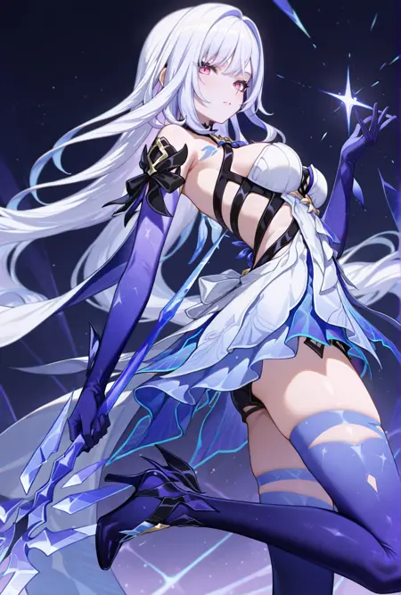 | Trained Words | 1girl, solo, long hair, medium breasts, white hair, white dress, detached sleeves, elbow gloves, pink eyes, blue gloves, purple gloves, blue sleeves, blue thigh-highs, high heels, holding weaponCopied! 1girl, solo, long hair, medium breasts, white hair, pink eyesCopied! |