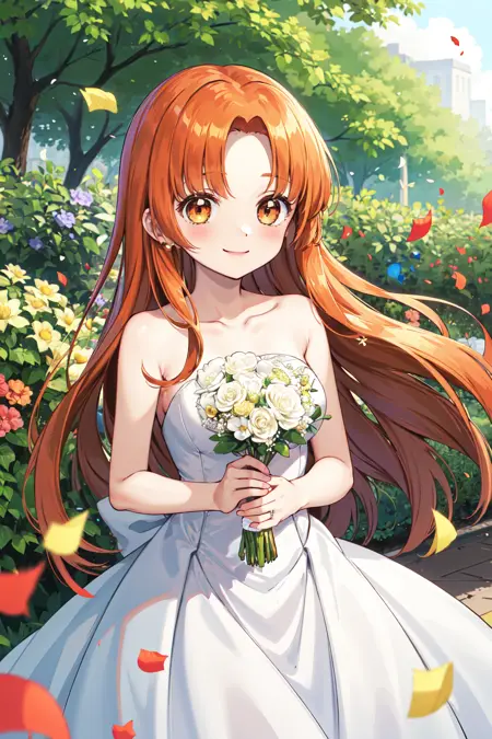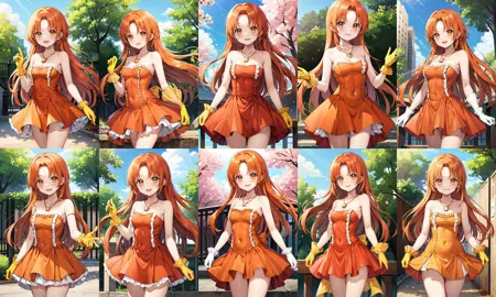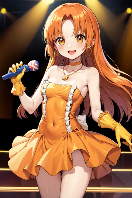 1girl, solo, long hair, orange hair, parted bangs, brown eyes, necklace, bare shoulders, frills, orange dress, strapless dress, yellow gloves