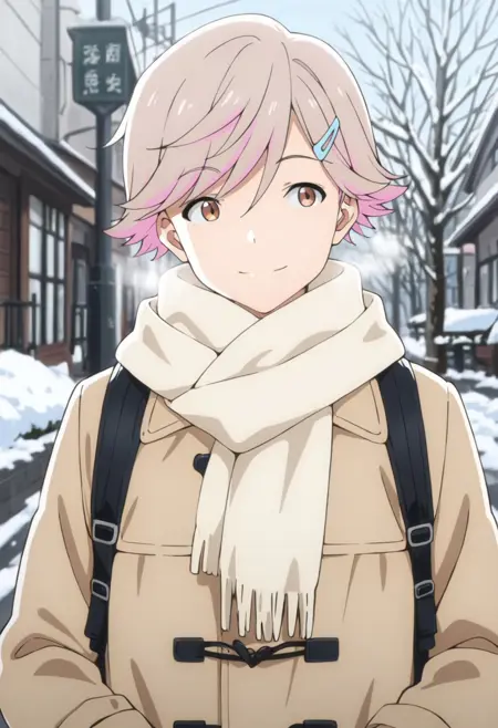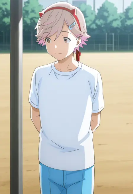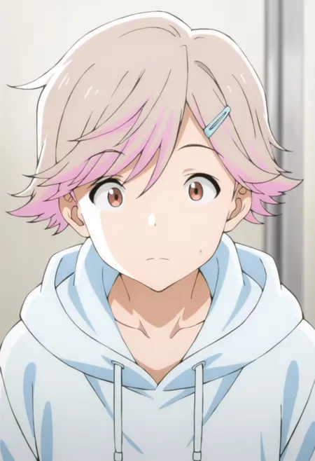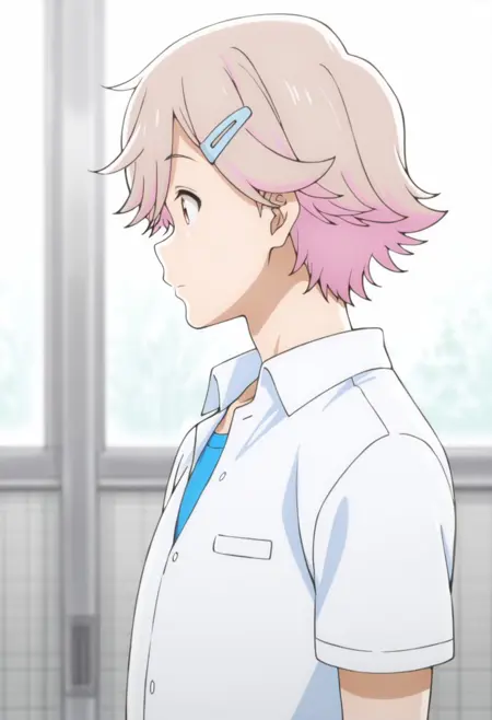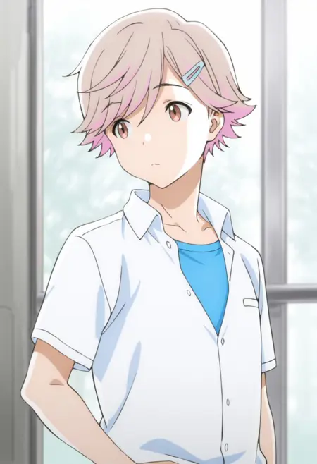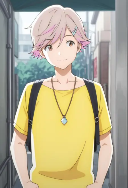 1boy, male focus, solo, brown eyes, light brown hair, pink hair, multicolored hair, hairpin, yellow shirt, t-shirt, collarbone, necklace, white pants, capri pants,