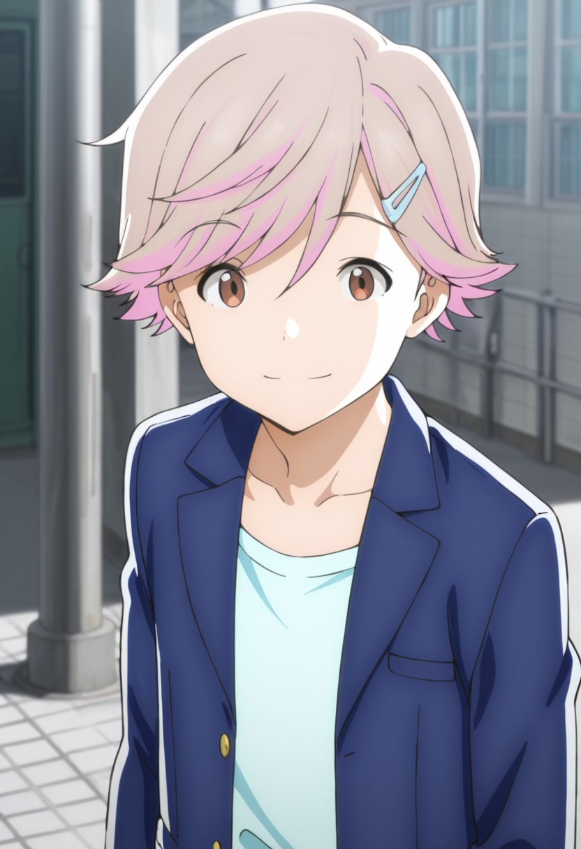 1boy, male focus, solo, brown eyes, light brown hair, pink hair, multicolored hair, hairpin, school uniform, blue jacket, blazer, open jacket, blue shirt, blue pants, shoes, black footwear,