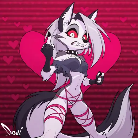 loona_(helluva_boss), 1girl, solo, animal ears, animal nose, asymmetrical hair, body fur, furry, furry female, grey fur, grey hair, red sclera, tail, two-tone fur, white eyes, white fur, wolf girl, wolf ears, wolf tail, long hair,