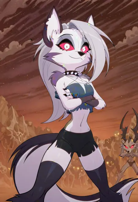 loona_(helluva_boss), 1girl, solo, animal ears, animal nose, asymmetrical hair, body fur, furry, furry female, grey fur, grey hair, red sclera, tail, two-tone fur, white eyes, white fur, wolf girl, wolf ears, wolf tail, long hair,