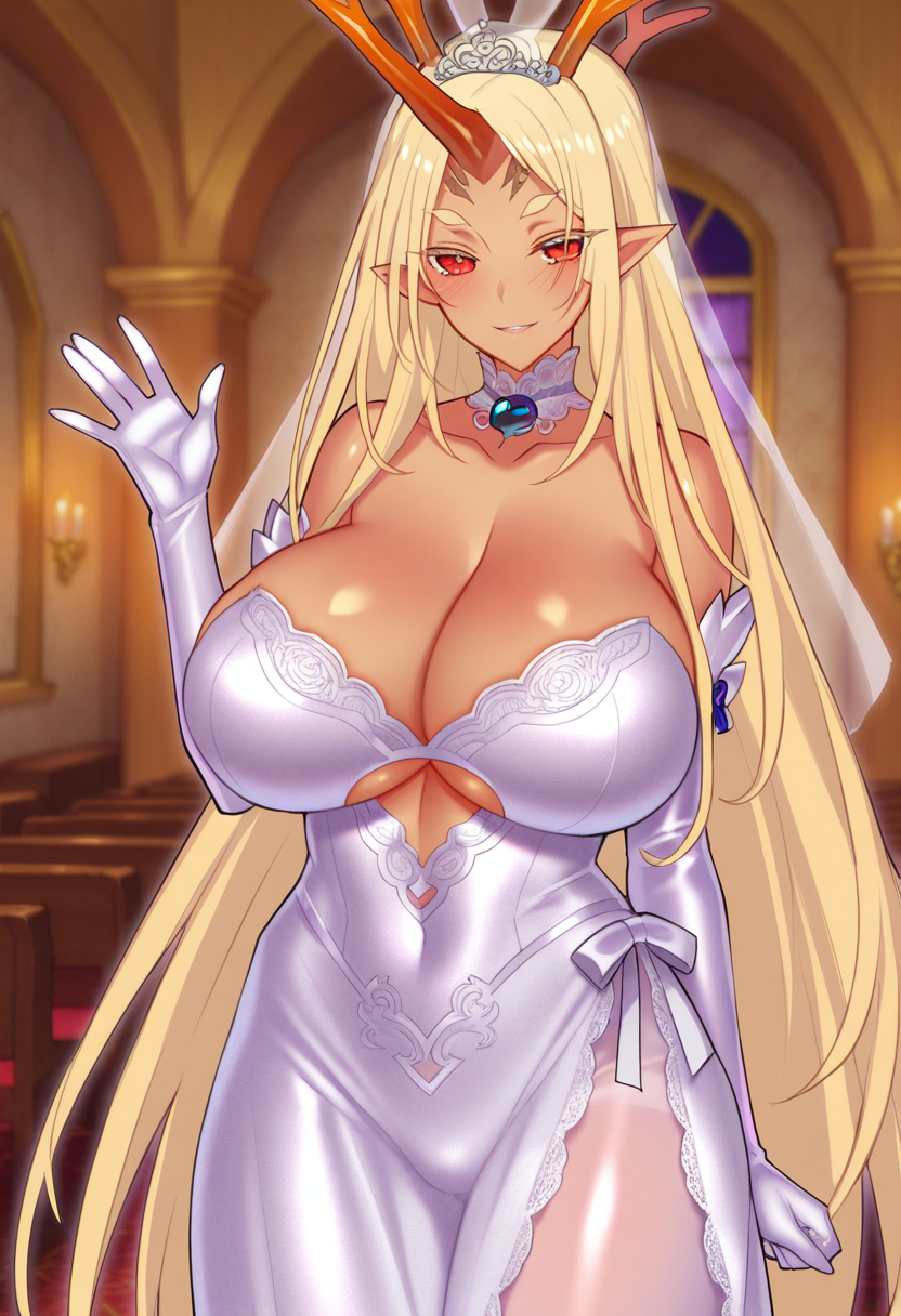 iekane_muramasa, 금발, 긴 머리, 붉은 눈, 뾰족한 귀, 뿔, 단일 뿔, 거대한 가슴