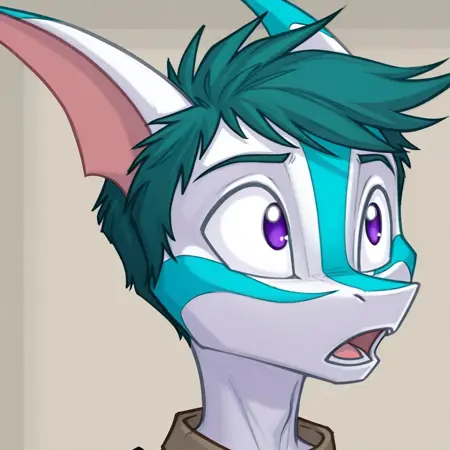 evzen_(dreamkeepers), 1boy, shark boy, furry, furry male, animal ears, white skin, blue skin, two-tone skin, solo, male focus, green hair, purple eyes, animal tail, shark tail, short hair, animal feet, colored skin,