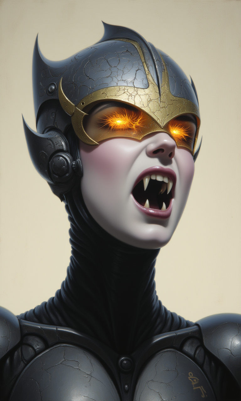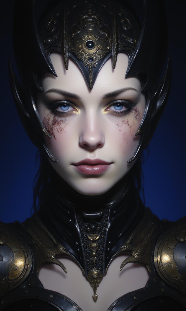 이 작품은 감각적인 인물, 생기기계적 갑옷, 피로 밝혀진 하늘, 빛나는 정맥, 극적인 키아로스쿠로 조명을 특징으로 하며, 풍부한 유화 질감의 미학으로 그려졌다.