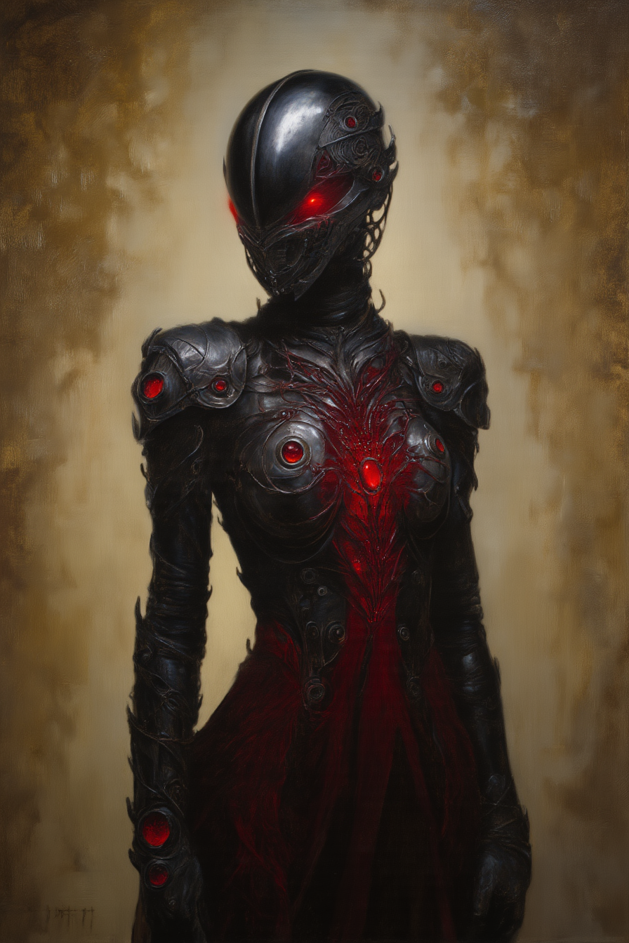 이 작품은 감각적인 인물, 생기기계적 갑옷, 피로 밝혀진 하늘, 빛나는 정맥, 극적인 키아로스쿠로 조명을 특징으로 하며, 풍부한 유화 질감의 미학으로 그려졌다.