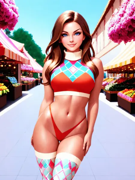 woman wearing sleefest with __color__ {argyle|criss cross|diamond|heart|stripes} {pattern|decoration} with {skirt|mini skirt|high leotard|leotard} bottom. {matching|__color__} stockings with __color__ {stripes|pattern|decoration}, turtleneck, {|||crop top, midriff}, {standing|middle shot|closeup},