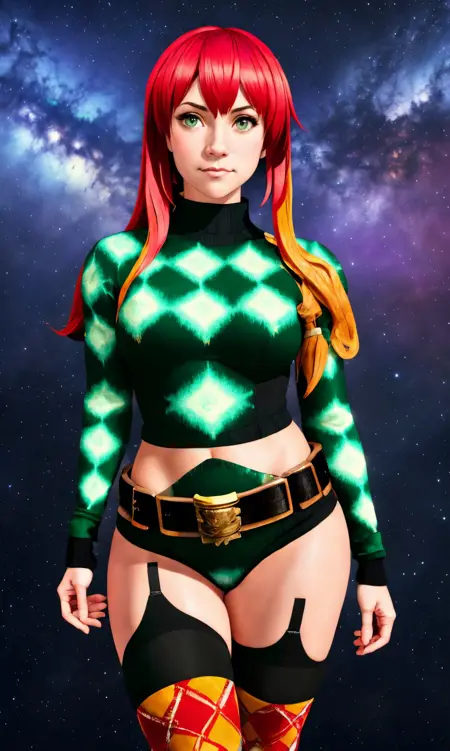 woman wearing sleefest with __color__ {argyle|criss cross|diamond|heart|stripes} {pattern|decoration} with {skirt|mini skirt|high leotard|leotard} bottom. {matching|__color__} stockings with __color__ {stripes|pattern|decoration}, turtleneck, {|||crop top, midriff}, {standing|middle shot|closeup},