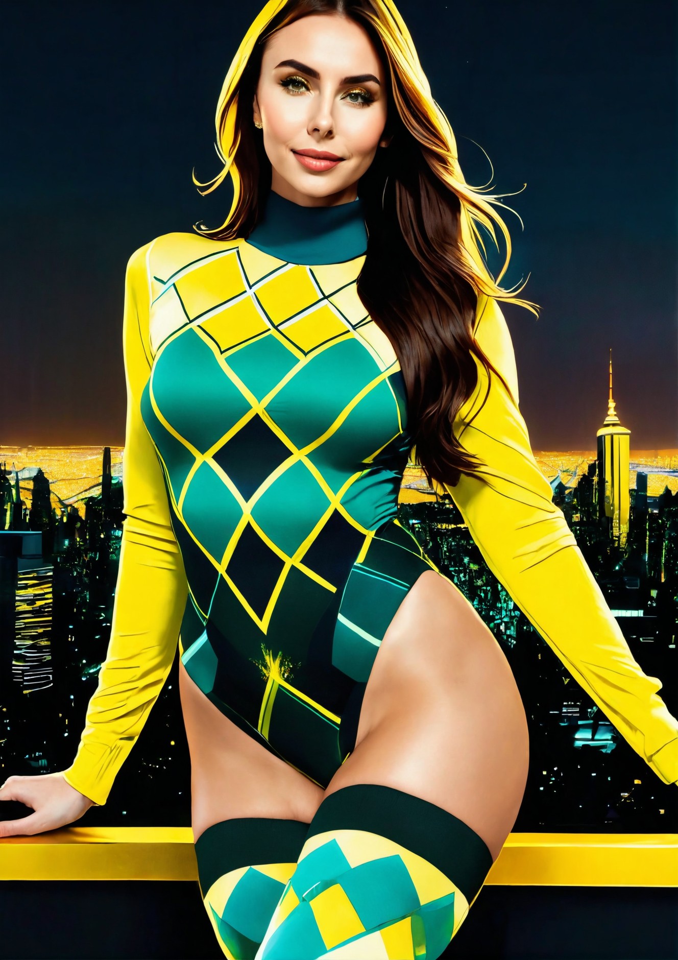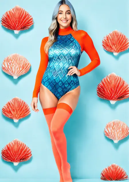 woman wearing sleefest with __color__ {argyle|criss cross|diamond|heart|stripes} {pattern|decoration} with {skirt|mini skirt|high leotard|leotard} bottom. {matching|__color__} stockings with __color__ {stripes|pattern|decoration}, turtleneck, {|||crop top, midriff}, {standing|middle shot|closeup},