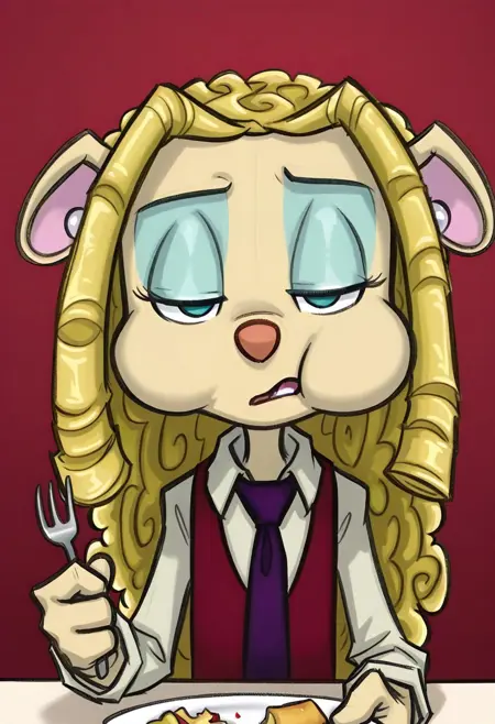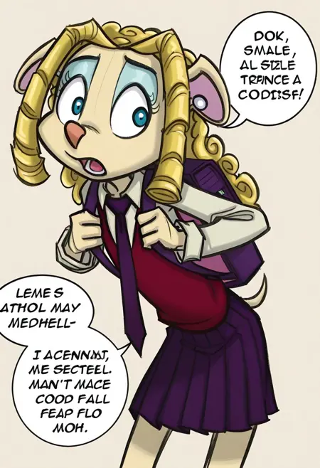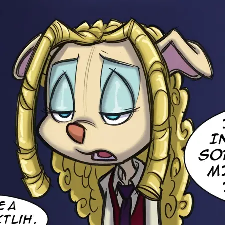 Stacephanie, 1girl, solo, 강아지 소녀, 동물 귀, 몸 털, 퓨리, 퓨리 여성, 곱슬머리, 금발, 동물 코, 파란 눈, 긴 머리, 꼬리,