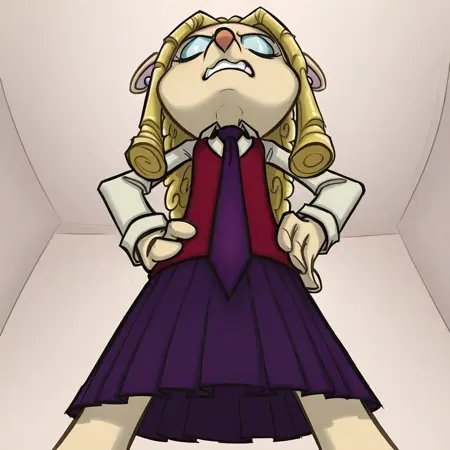 셔츠, 빨간 조끼, 넥타이, 보석, 귀걸이, 치마, 칼라 셔츠, 보라색 넥타이, 검은 신발, 구두,